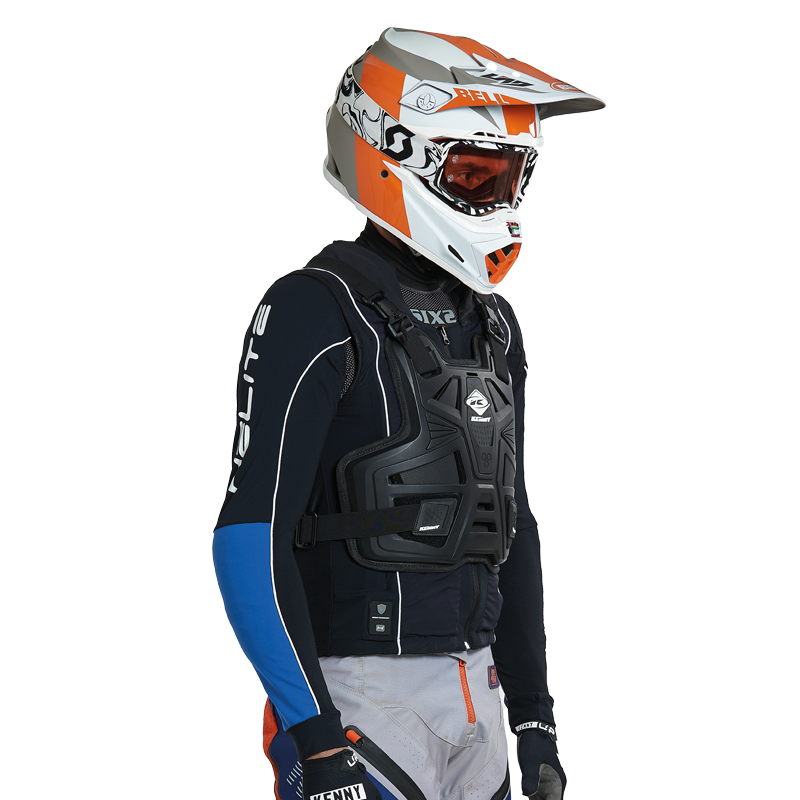 Développé et approuvé à la pratique off-road, le gilet protège les zones vitales (pectorale Kenny Mission EN 1621-3 niveau 2, coudes et épaules SAS TEC niveau 2 et intègre la technologie Turtle (dorsale SAS TEC niveau 1).