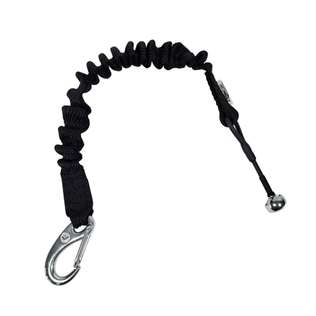Un mousqueton et une bille se trouvent à chaque extrémité du cordon d'attache. La bille est positionnée sur le percuteur et maintient le système mécanique sous tension. Lorsque vous êtes sur votre cheval, le mousqueton doit être accroché à l'anneau métallique de la sangle d'étrivières.